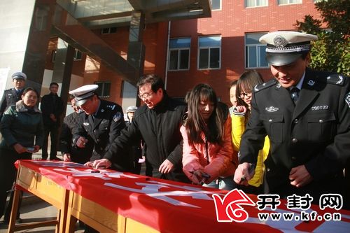 开封网讯 记者 李蕙君 袁洋报道 为进一步增强交通参与者的法治意识、安全意识、文明意识,在12月2日全国交通安全日即将到来之际,11月28日,以“摒弃交通陋习,安全文明出行”为主题的交通安全日系列活动启动仪式在bat365在线官方网站举行,我市社会各界及bat365在线官方网站学生共2000余人在现场签名,动员全社会共同关注交通安全。