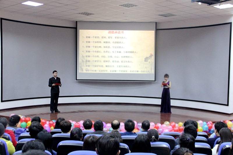 本次道德讲堂以“唱响价值观·文明我先行”为主题,通过身边人的故事,讲述社会公德、职业道德、家庭美德和个人品德,提升大学生的道德素养,帮助他们洗涤心灵、感悟道德,做一个崇尚道德品质,遵守道德规范的人。活动共分为看文艺、演小品、听事迹、学模范、谈感悟、诵经典、做承诺、唱歌曲等八个环节。