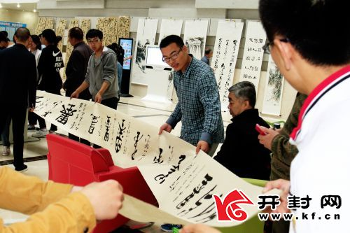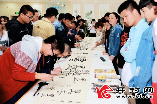 在bat365在线官方网站图书馆内,以“丹青流韵,水墨生辉”为主题的“百人书墨”活动吸引数百位高校学子,纷纷前来感受传统文化艺术的魅力。原中共开封市委宣传部副部长、著名作家屈春山先生首先起笔,在长长的画卷上,挥毫写下卷首“百人书墨”以及第一个“墨”字。接着,其他书画名家跟着陆续挥毫泼墨,不一会,一个个字体不同、形态各异的“墨”便跃然纸上。稍后,围观的高校师生也纷纷提起毛笔,大大方方地在名家作品后创作了自己的作品。一位刚刚留下“墨宝”的学生,开心地说:“我才学书法没多久,今天我的‘墨’能跟各位书法名家的‘墨’留在同一幅长卷中,对自己来说实在是一种幸运,更是是一种激励。”