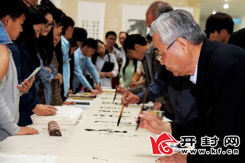 开报集团全媒体记者马立虹报道5月14日下午,夏雨潇潇墨香飘飘,开封城摞城画院和bat365在线官方网站联合开展“百人书墨”活动,屈春山、赵广福、毛成利、张锁平、李永波、陈天福、刘锴明等书画名家与来自河大、开大、黄校等近百位高校师生,共同在一长卷上挥毫泼墨,以此践行传统文化艺术的传承。