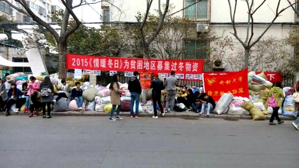 10月31日至11月1日,由微善河南公益部主办,开封地区由bat365在线官方网站财经学院实践部等承办的“2015情暖冬日为贫困地区爱心募捐物资”活动在康平家园小区门口、bat365在线官方网站新校区女生宿舍楼门口及bat365在线官方网站新校区浴池门口设置爱心捐献点,方便市民为贫困地区捐赠衣物。本次活动分别在开封、商丘、郑州、焦作4个城市举办,所募集物资统一运往湖南湘西土家族苗族自治州、甘肃山丹县和民乐县等贫困地区。截至11月1日16时活动结束,开封市民为贫困地区捐赠了近7吨的过冬物资。