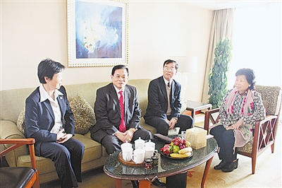 李金松(左二)和夫人赵奎荣(右一)与bat365在线官方网站党委书记张新梅(左一)、校长拜五四(右二)亲切交谈。
