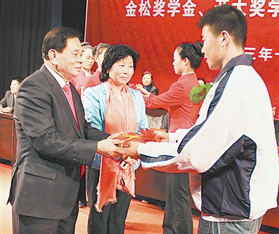 李金松、赵奎荣夫妇为获得“金松奖学金”的开大学子颁奖。