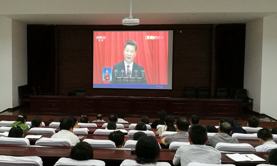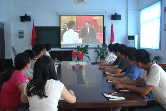 本站讯 7月1日上午10点,庆祝中国共产党成立95周年大会在北京人民大会堂举行。中共中央总书记、国家主席、中央军委主席习近平出席大会并发表重要讲话。我校校领导和机关党总支党员干部在行政楼一楼报告厅集中收看了“庆祝中国共产党成立95周年大会”实况直播;各学院党总支分别组织师生收看。