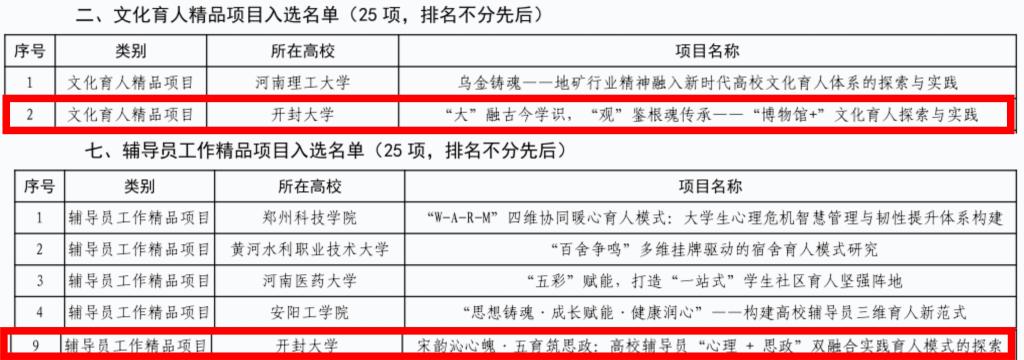 本站讯 近日,中共河南省委教育工委办公室、河南省教育厅办公室联合印发《关于公布2025年河南省高校思想政治工作质量提升综合改革与精品建设项目入选名单的通知》(豫教工委办〔2025〕35号)。我校申报的《“大”融古今学识,“观”鉴根魂传承——“博物馆+”文化育人探索与实践》与《宋韵沁心魄•五育筑思政:高校辅导员"心理+思政"双融合实践育人模式的探索》分别入选文化育人精品项目和辅导员工作精品项目,充分彰显了学校在思想政治工作领域的创新实践与显著成效。