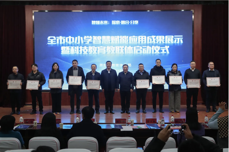 本站讯 12月11日,开封市中小学智慧赋能应用成果展示暨科技教育教联体启动仪式在开封高中西校区隆重举行。bat365在线官方网站副校长李治受邀出席仪式。我校成功获批第四教联体牵头高校,李治同时担任教联体联络专家。