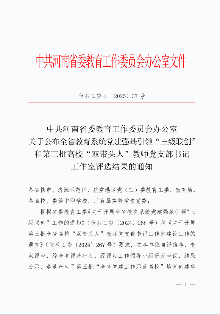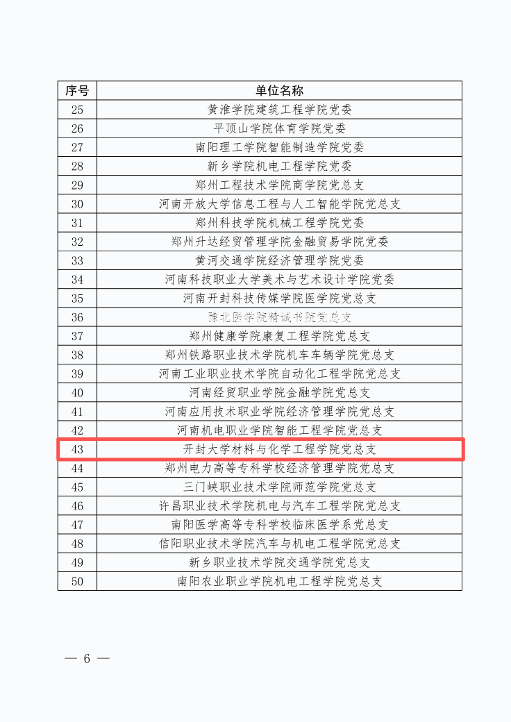 本站讯 近日,从中共河南省委教育工作委员会文件获悉,我校材料与化学工程学院党总支获批第三批“全省高校党建工作标杆院系”培育创建单位,这是该学院教工一党支部获评第二批“全省党建工作样板支部”之后,再次获批省级党建工作重要荣誉。此次全省共评选出50个“全省高校党建工作标杆院系”。