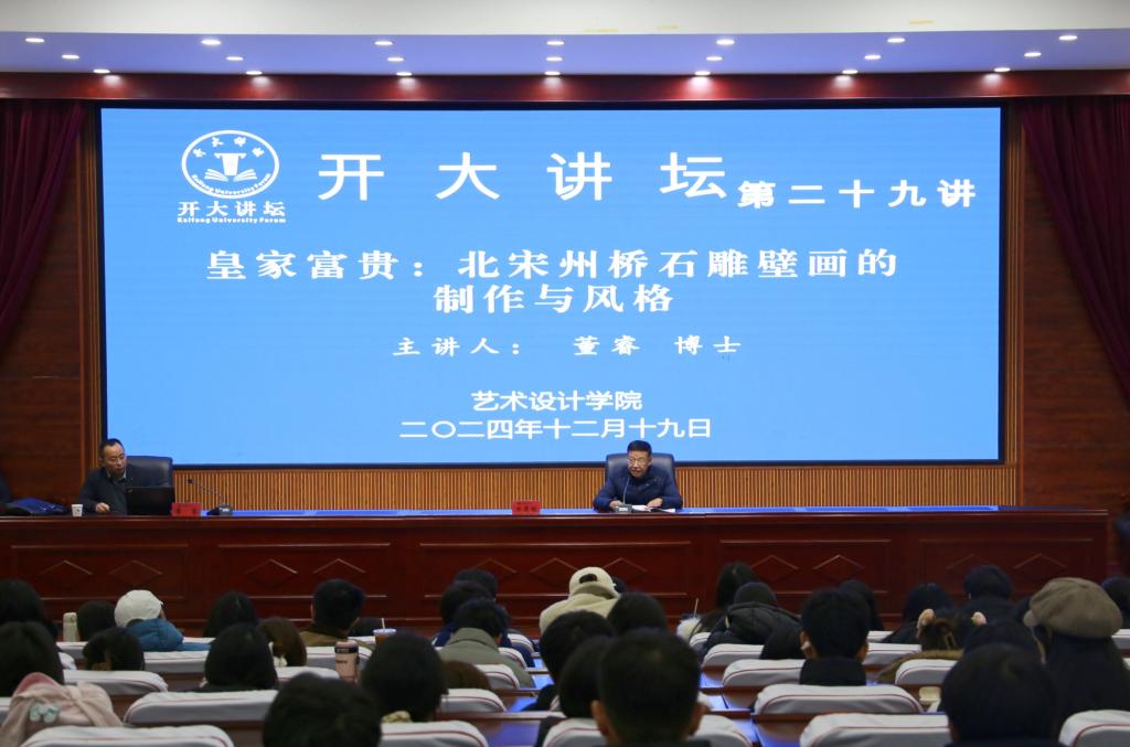 本站讯  12月19日下午,“开大讲坛”系列讲座第二十九讲在行政楼第一会议厅隆重举行。本次讲座由艺术设计学院主办,特邀河南大学美术学院副教授、硕士研究生导师、中央美术学院美术学博士、河南大学考古学博士后、芝加哥大学艺术史系及北京大学艺术学院访问学者董睿作了题为《“皇家富贵——北宋州桥石雕壁画的制作与风格”》的学术讲座。副校长万是明出席讲座并致辞,艺术设计学院党总支书记赵志成、院长张富云及学院师生代表260余人参加讲座,讲座由张富云主持。