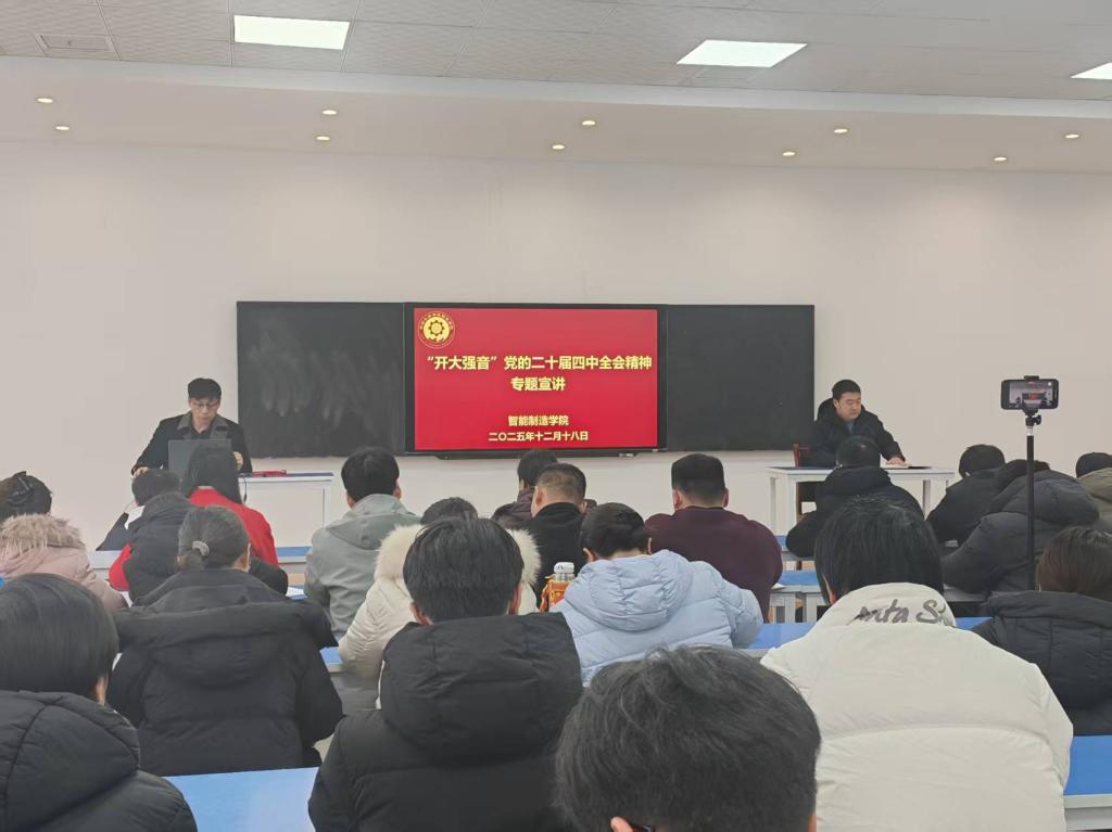 本站讯 为深入学习宣传贯彻党的二十届四中全会精神,引导全院师生统一思想、凝聚共识,12月18日下午,智能制造学院在6号楼321会议室开展“开大强音”党的二十届四中全会精神专题宣讲活动。活动特邀学校宣讲团教师、马克思主义学院党总支书记李鹏担任主讲,全院师生代表共同参加学习。