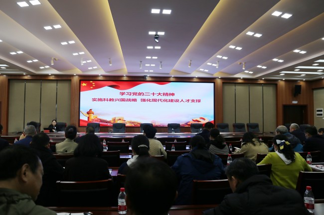我校马克思主义学院副院长左慧琴以《学习党的二十大精神 实施科教兴国战略 强化现代化建设人才支撑》为题,围绕党的二十大的主题、主要成果,过去5年的工作和新时代10年的伟大变革,马克思主义中国化时代化,中国式现代化,全面建设社会主义现代化国家的目标任务,坚持党的全面领导和全面从严治党等方面学习宣传贯彻党的二十大精神,尤其是结合教科文卫体工作对党的二十大报告中提出的“实施科教兴国战略 强化现代化建设人才支撑”进行了宣讲报告。
