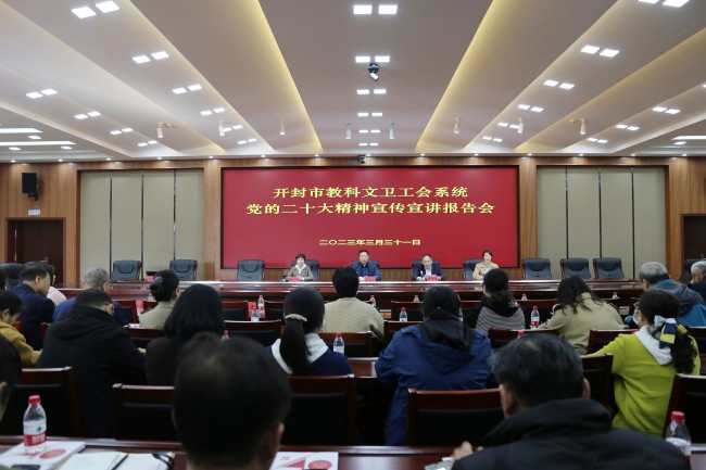 本站讯 2023年3月31日上午,开封市教科文卫体工会学习宣传贯彻党的二十大精神主题宣讲活动在我校行政楼第二会议厅举办。开封市总工会教科文卫体工会主席王建立、组织部部长柴世宏,我校党委委员、工会主席成芳,开封市教育、科学、文化、卫生、体育系统80多家单位的工会主席、副主席及我校工会全体人员100余人参加了学习。会议由开封市卫健委机关党委副书记杨学建主持。