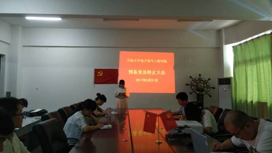 发展大会在庄严的党旗下隆重举行,,由学院学生支部书记王笑禹老师主持,转正工作按照组织发展程序有条不紊的进行,此次共有四名预备党员同学如期转正。