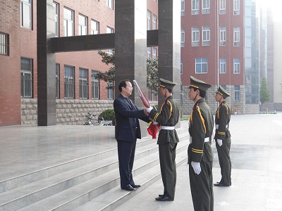 在大家的注视下,7点,我校国旗护卫队队员身穿军装,迈着整齐的步伐接受院党总支马广卿书记的授旗。当《国歌》奏响,五星红旗随风展开,冉冉升起的那一刻,全场师生怀着激动的心情,保持立正姿势,向国旗行注目礼,齐唱国歌,表情庄严而神圣。