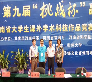 第九届“‘挑战杯’赢响中原”河南省大学生课外学术科技作品竞赛终审决赛6月3日至4日在郑州大学新校区中心体育馆隆重举行,来自全省70余所高校的参赛选手同台竞技。河南省政府副省长、竞赛指导委员会主任徐济超,团省委书记、竞赛指导委员会副主任侯红等领导出席了开幕式。我校由副校长万是明带队,团委书记樊玉霞和老师、学生共6人参加了终审决赛。