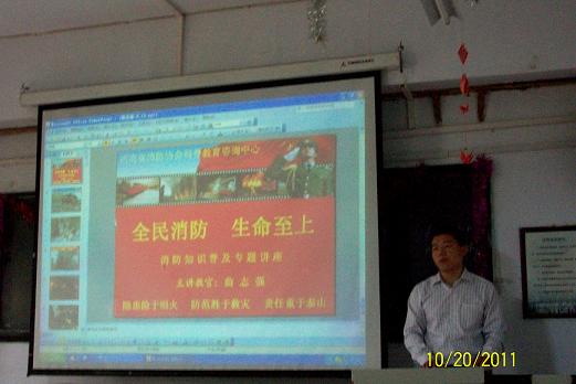 本站讯: 为确保消防安全,防患于未然,2011年10月20日下午,机电学院邀请到河南省消防安全教育宣讲员曲志强教官进行了一场生动的消防知识宣传讲座,并演示了消防设备的使用。学院领导及各位老师聆听了讲座。