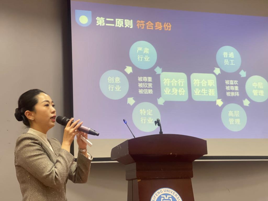 王思齐从形象的真谛、专业形象、人物风格特征、体型穿搭等方面,引导同学们在不同的场所穿戴合适的装扮,以提升个人气质。讲座过程中,同学们互相扮演面试官,王思齐对同学们职场面试礼仪进行指导。讲座最后,她耐心解答同学们的疑惑,指导同学们更好地进行生活中的文明社交和职业形象塑造。