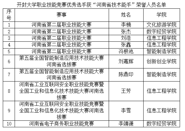本站讯  近日,河南省人力资源和社会保障厅发布《关于授予职业技能竞赛优秀选手河南省技术能手荣誉的决定》,我校10人在职业技能竞赛中成绩优异,被授予“河南省技术能手”荣誉,并颁发荣誉证书和奖章。