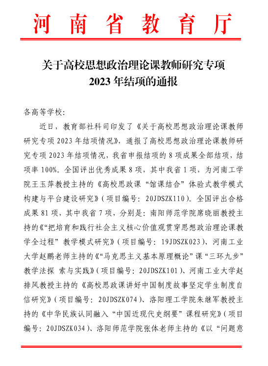 本站讯 近日,教育部社科司印发了《关于高校思想政治理论课教师研究专项2023年结项情况》,通报了高校思想政治理论课教师研究专项2023年结项情况,经专家评审,社科司审核,评出优秀成果8项,合格成果81项。我校常素芳老师主持的《“关键在党”命题融入高校思政课教学研究》和我省其他7个项目顺利通过验收,河南省教育厅对此予以通报表扬。