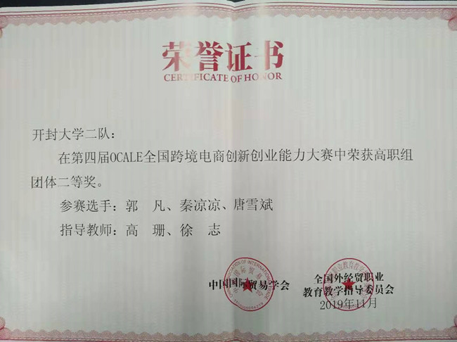 近日,中国国际贸易学会与全国外经贸职业教育教学指导委员会公布了第四届OCALE全国跨境电商创新创业能力大赛结果,我校财政经济学院两支代表队分别荣获大赛团体二等奖和团体三等奖。