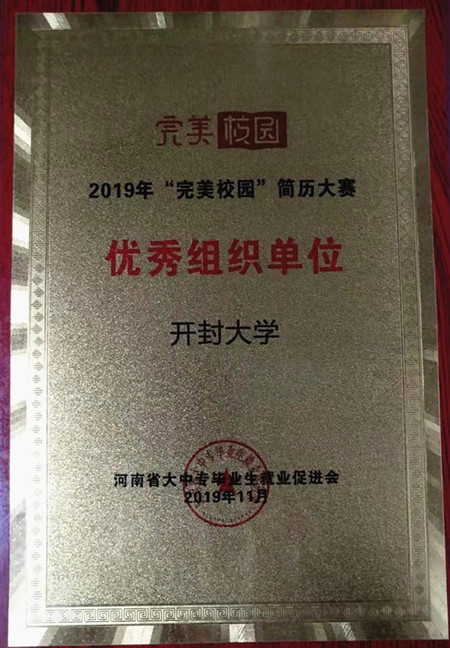 近日,在河南省大学生就业创业综合服务基地举行河南省2019“完美校园”简历大赛颁奖典礼,我校获得优秀组织单位奖荣誉称号。