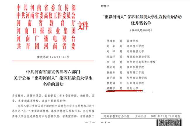 我校学生梁鹏宇荣获“出彩河南人”第四届最美大学生宣传推介活动优秀奖
