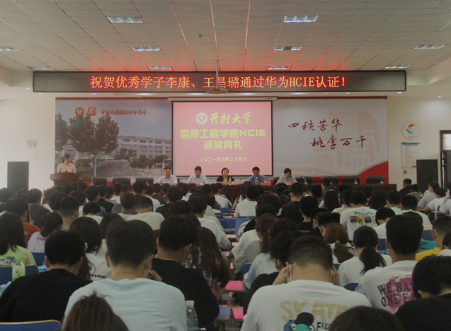 本站讯 6月24日下午,我校信息工程学院HCIE颁奖大会在土木建筑工程学院六楼报告厅举行。华为政企业务部开封总经理杨昊,校党委委员、副校长赵辉出席了大会,教务处处长冯天才、信息工程学院党总支书记袁震、院长杨桦等领导和信息工程学院全体教师和各专业学生代表300余人参加了大会。大会由信息工程学院副院长李响主持。