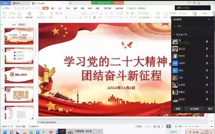 为深入学习贯彻党的二十大精神,11月6日晚,旅游学院学生党支部通过钉钉线上平台的方式,开展了以“学习党的二十大精神,团结奋斗新征程”为主题的党日活动。活动由旅游学院学生党支部组织委员陈加龙老师主持。