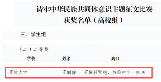在全省铸牢中华民族共同体意识主题征文比赛中,我校材料与化学工程学院学生王俪静获得学生组二等奖。