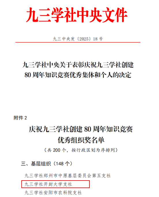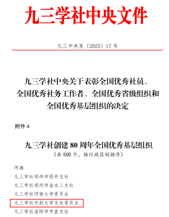 九三学社中央印发《九三学社中央关于表彰全国优秀社员、全国优秀社务工作者、全国优秀省级组织和全国优秀基层组织的决定》,对在工作中作出突出成绩的组织和个人进行了评选表彰。其中,九三学社bat365在线官方网站支社委员会荣获九三学社创建80周年“全国优秀基层组织”称号,这是我校九三学社支社创建以来首次获得九三学社中央表彰,也是开封市唯一获此殊荣的九三学社基层组织。