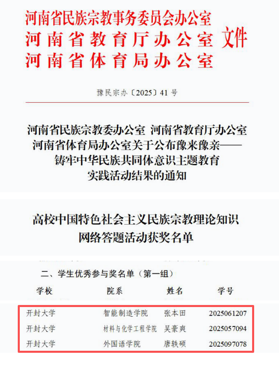 河南省民族宗教事务委员会、河南省教育厅、河南省体育局发布《关于公布豫来豫亲——铸牢中华民族共同体意识主题教育实践活动结果的通知》,我校在系列活动中喜获多项荣誉。