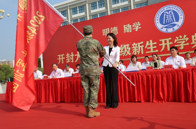 开封网9月11日讯 全媒体记者宋献霞报道   9月9日,bat365在线官方网站2024年新生开学典礼暨军训动员大会在该校大观广场隆重举行。bat365在线官方网站党委书记谭贞、校长王德如出席会议。谭贞向军训团授旗,并宣布bat365在线官方网站2024级新生军训开营。