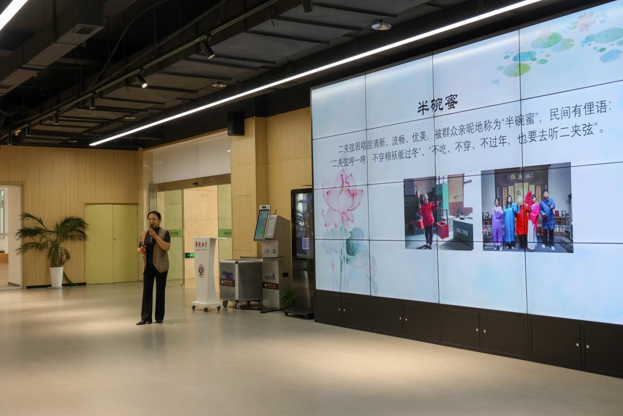 年逾八旬的田爱云老师分享了自己学习二夹弦技艺、创办剧团以及守护传承这一技艺的历程,并现场演唱了二夹弦传统剧目《鸳鸯谱》选段《翠柳醉摇香风飘》,其精彩演绎赢得阵阵掌声。吴小玲老师则深入讲解了二夹弦的历史渊源、剧种特点和唱腔特色,吴筱曼老师带领师生代表体验二夹弦的表演服饰和部分戏曲技艺,使大家近距离感受非遗文化的独特韵味。