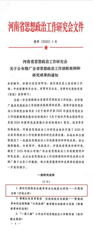 (来源:大象新闻) 近日,河南省思想政治工作研究会正式公布2025年度全省思想政治工作创新案例与研究成果评选结果。其中,校长王德如主持的项目《新时代理想信念教育常态化制度化研究 —— 以高校为例》获评全省思想政治工作一类研究成果。