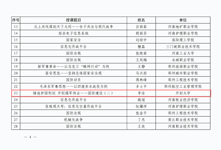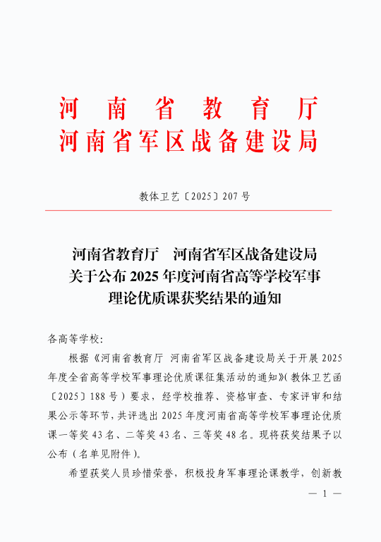(来源:大象新闻)近日,河南省教育厅、河南省军区战备建设局公布了2025年度全省高等学校军事理论优质课获奖名单,我校信息工程学院教师李洁讲授的课例《铸造护国利剑 开创强军伟业——国防建设(二)》荣获一等奖。