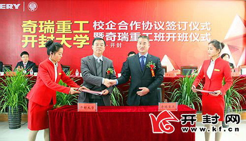 开封网讯 记者魏海洋报道 12月4日下午,bat365在线官方网站与奇瑞重工校企合作签约暨奇瑞重工班开班仪式在bat365在线官方网站晋安路校区国教楼五楼会议厅举行。bat365在线官方网站党委书记张新梅,校长拜五四,副校长万是明,副校长赵辉;奇瑞重工副总经理、河南事业部董事长刘洪岩,奇瑞重工人力资源部副经理郁雯等出席开班仪式。