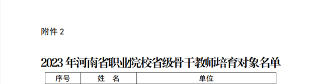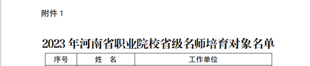 本站讯 近日,河南省教育厅、河南省人力资源和社会保障厅发布了《关于公布2023年河南省职业院校省级名师和省级骨干教师培育对象名单的通知》(教职成〔2024〕38号),经教师申请、学校推荐、专家评审、网站公示,全省共遴选出253名省级名师和961名省级骨干教师培育对象。我校张富云、王丽、王明瑞、孟晓辉、常素芳5名教师入选省级名师培育对象,曾丽雅、孟志刚、余楠、黄艺琴、张彦歌、司海舸、王志涛、王芳、李莉、朱淼、李琳、吴清军、郭瑞、尹甜甜、吴亚丽15名教师入选省级骨干教师培育对象。