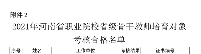 本站讯 10月20日,河南省教育厅办公室发布《关于公布2021年河南省职业院校省级名师和省级骨干教师培育期满考核结果的通知》,经学校自主考核,省教育厅、省人力资源社会保障厅组织专家综合审核,公示无异议后,我校省级名师李治、师兆忠、李军、赵书锋考核合格,省级骨干教师李响、刘悦、王晓婷、边疆、蒋大山、李林考核合格。