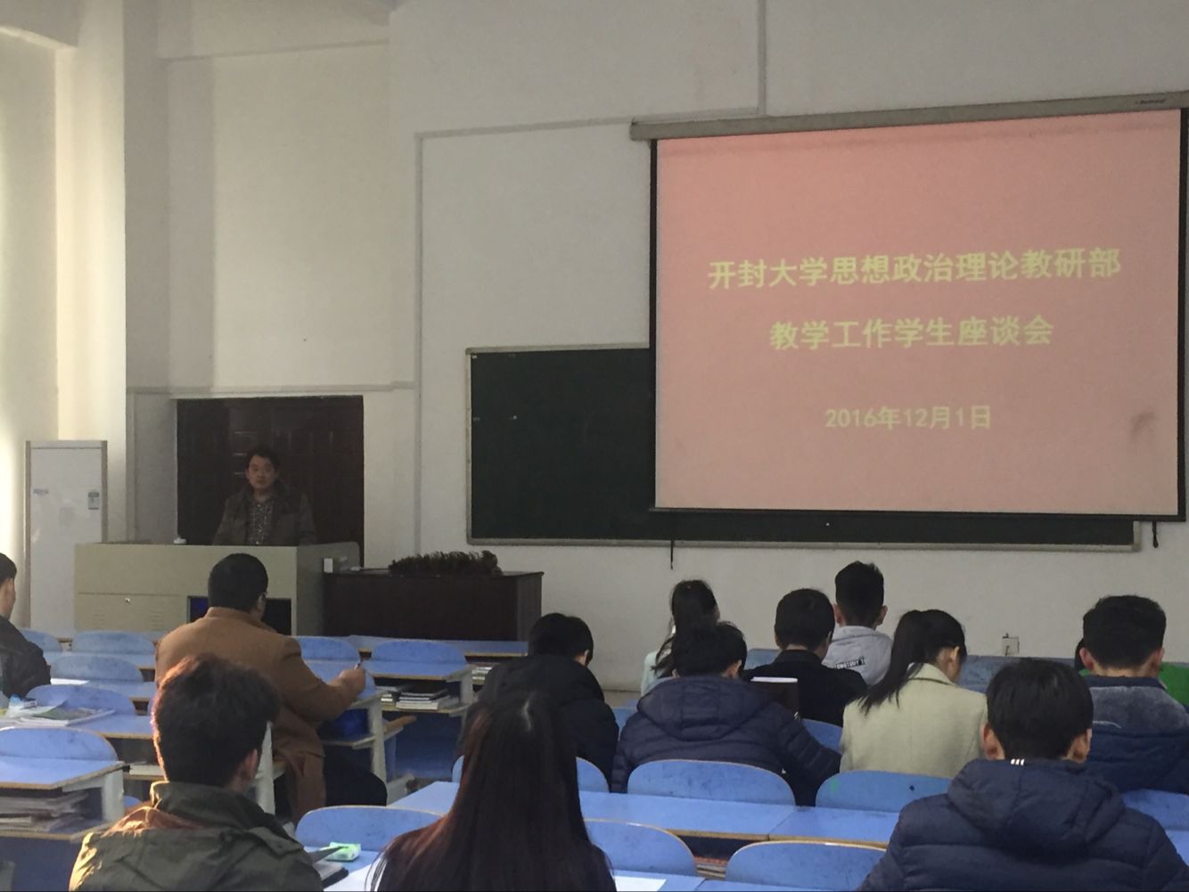 12月1日下午,思想政治理论教研部组织各院部学生代表在15号楼101教室召开2016-2017学年第一学期教学工作学生座谈会,教研部主任常素芳出席了座谈会,参加座谈会的还有各教研室主任和教研部秘书及20名学生代表。座谈会由思想政治理论教研部副主任陈友东主持。