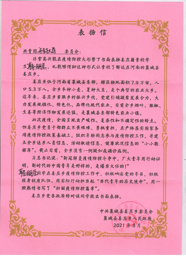 近日,土木建筑工程学院收到一封来自襄城县姜庄乡人民政府的感谢信,信中对我院2019级土木工程专业韩明臣同学主动请缨争当志愿者、为当地疫情防控工作无私奉献给予了高度肯定和表扬。