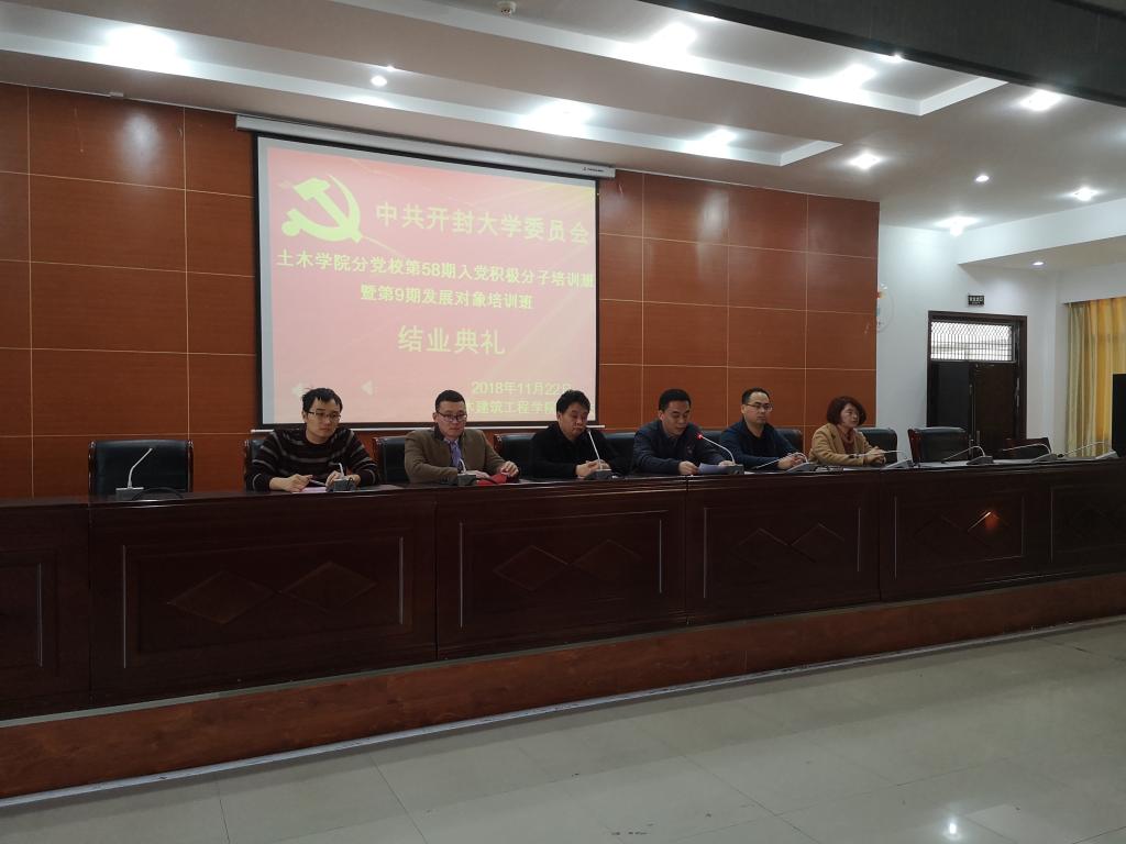 2018年11月22日下午,土木建筑工程学院在八号楼报告厅举行第9期发展对象培训班暨第58期入党积极分子结业典礼。参加本次活动的有学院党总支书记王渊辉,党总支副书记成诤磊,各班辅导员以及全体培训班学员,仪式由团总支书记武志远主持。