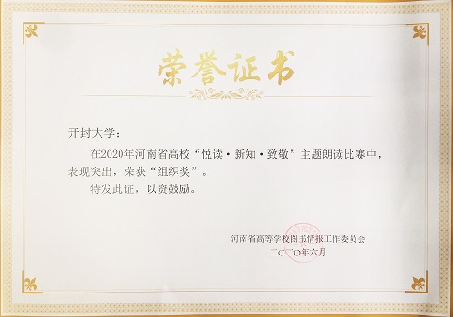 日前,河南省高等学校图书情报工作委员会组织的“悦读·新知·致敬”主题朗读比赛揭晓,bat365在线官方网站图书馆荣获“优秀组织奖”,选送的2个作品也分别获得三等奖和优秀奖。