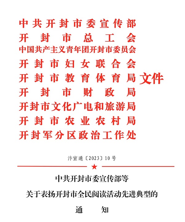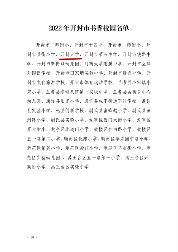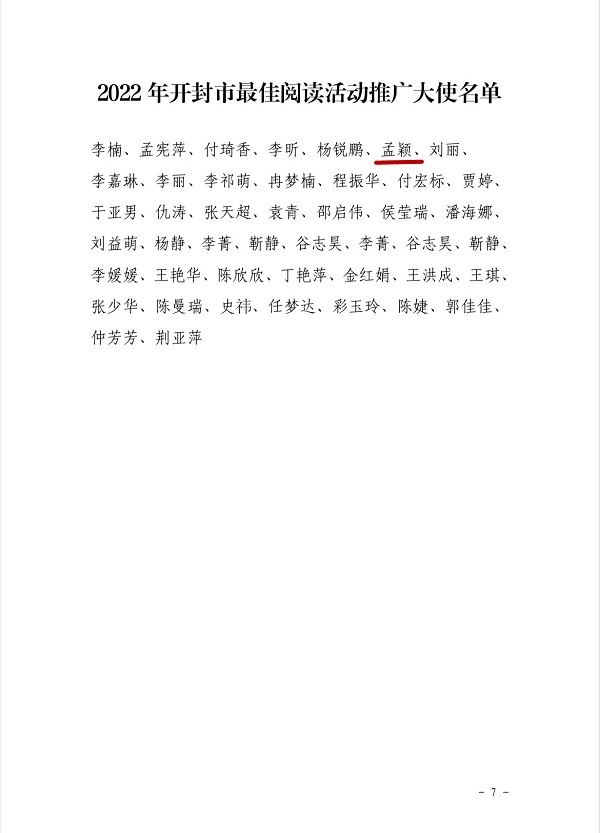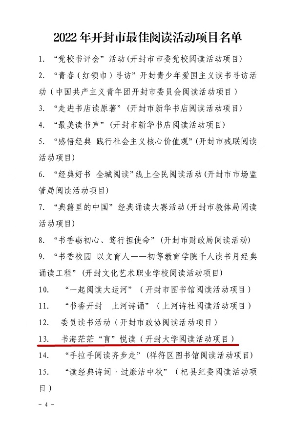 近日,由中共开封市委宣传部等部门联合下发的表彰中,我校被评为“2022年开封市书香校园”,图书馆报送的《书海茫茫“盲”悦读》读书活动获“开封市最佳阅读活动项目”,图书馆孟颖老师获“最佳阅读活动推广大使”。