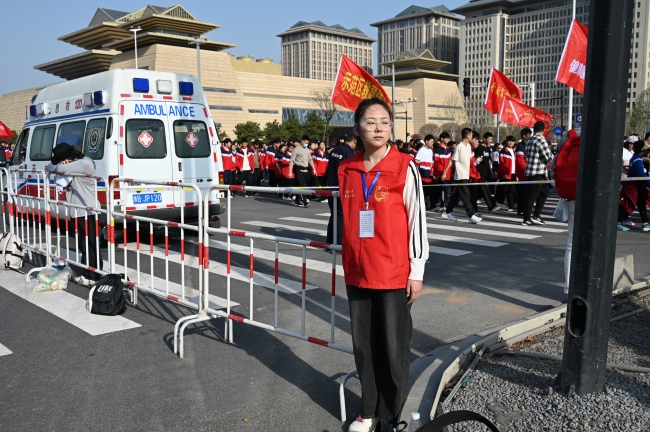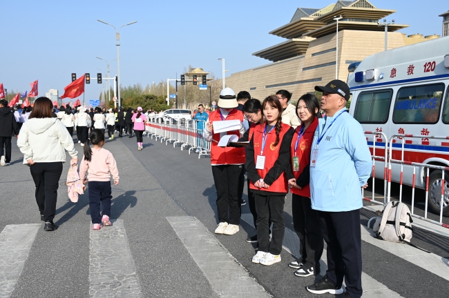在开封市市民之家广场,随着郑开马拉松欢乐跑(开封段)比赛的开始,竞赛组志愿者们也奔跑起来,步履不停、满腔热情地投入到指引跑道路线,在分流点、折返点秩序维护,协助裁判及计时工作人员做好计时等工作中,将温暖与鼓励带给每一支参赛队伍。