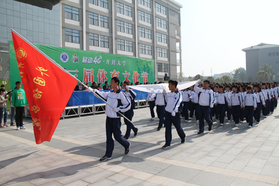 在庄严热烈的运动员进行曲中,13个院部方阵依次入场,他们精神饱满,意气风发,展现了开大人锐意进取、奋发向上的精神风貌。