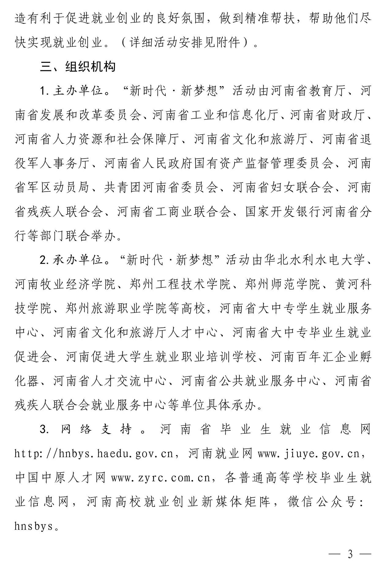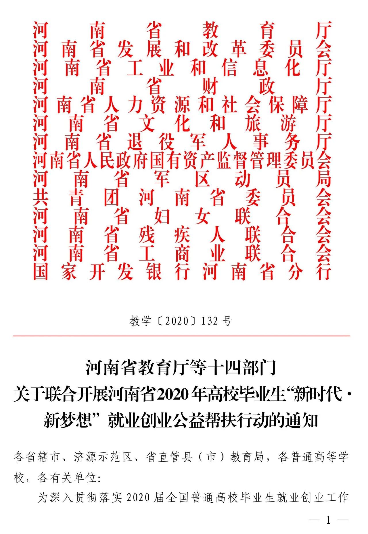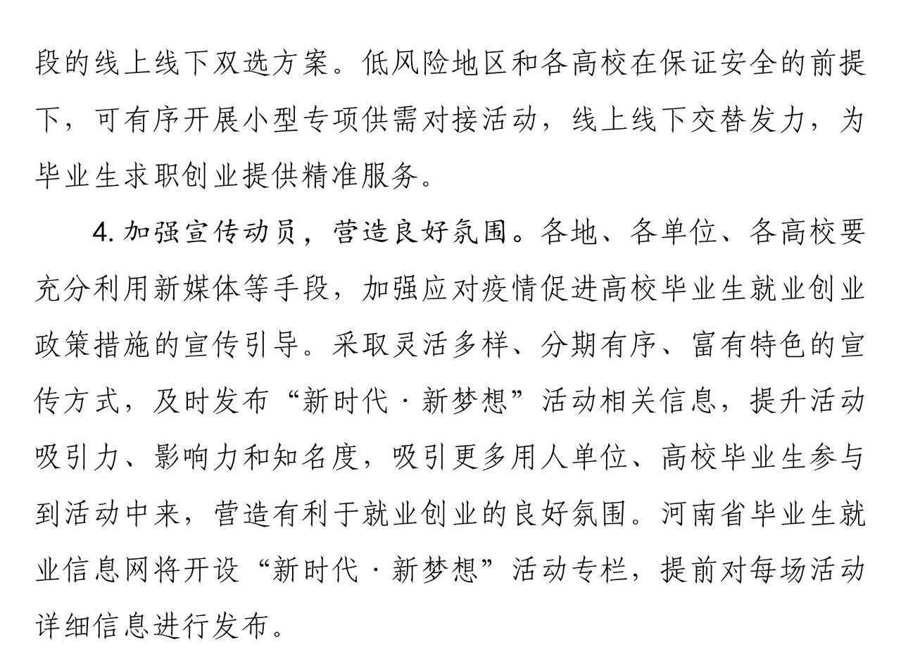 为落实教育部等六部门2020届普通高校毕业生就业“百日冲刺”行动,最大限度降低新冠肺炎疫情对高校毕业生就业的影响,省教育厅、省发展和改革委员会、省工业和信息化厅、省财政厅、省人力资源和社会保障厅、省文化和旅游厅、省退役军人事务厅、省人民政府国有资产监督管理委员会、省军区动员局、共青团河南省委员会、省妇女联合会、省残疾人联合会、省工商业联合会、国家开发银行河南省分行14部门于近日联合下文,共同实施“河南省2020年高校毕业生‘新时代·新梦想’就业创业公益帮扶行动”。