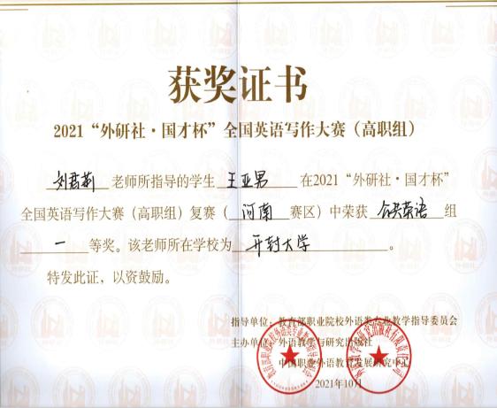 近日,2021“外研社·国才杯”全国英语写作大赛(高职组)河南省复赛在黄河水利职业技术学院举行。我校外国语学院张秀芳老师指导的20级应用英语专业3班学生许乐华荣获英语专业组二等奖。公共外语教师刘君莉和顾军指导的人文学院19级新闻采编与制作一班学生王亚男和20级文化创意与策划一班学生赵莹分别荣获公共英语组一等奖和二等奖。