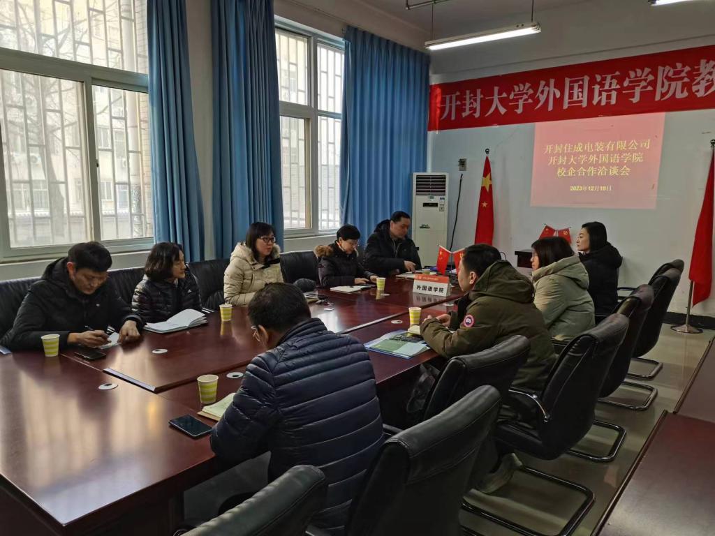 12月19日下午,外国语学院与开封住成电装有限公司在学院会议室召开校企合作洽谈会,学院领导班子成员及开封住成电装有限公司管理部部长田明、人事科科长秦国艳参加会议。