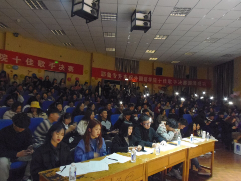 外国语学院为丰富校园文化生活,营造积极向上的校园文化气氛,给同学们提供展示才华的舞台,于2019年11月17日晚,外国语学院在国教一号报告厅举办"十佳歌手大赛,学院三百五十多名学生观看了比赛。经过层层选拔,18名歌手成功晋级,站上了决赛的舞台。 院党总支副书记陈茜、全体辅导员和350余名学生参加此次活动。决赛的场面异常火爆,怀揣着激情与梦想,选手们一上台,便让在场所有人感受到了他们展现才华的渴望和洋溢青春的热情。首先由KD1街舞社为我们带来的开场舞《lalalay》,热完场之后让我们正式进入到今天的主题,台下同学们热情高涨,呐喊着为上台的每一位选手加油、鼓劲、助威。《我怀念的》《多想在平庸的生活拥抱你》《岁月神偷》、《易燃易爆炸》 、《遇见》 、《阴天快乐》等一首首歌曲将比赛现场的气氛带动得淋漓尽致。中场由动漫社带来的舞蹈表演《KDA-POP STARS》将“十佳歌手大赛”推向高潮。参赛选手们精彩的演出,让我们感受了到他们的才华横溢,感受到他们了青春的个性飞扬。比赛的过程中,每个选手都站上了这个展现自我的大舞台,呈现了最完美的自己。最终19应用日语一班黄玉婷和19级商英二班马识途并列了本次比赛的冠军。
