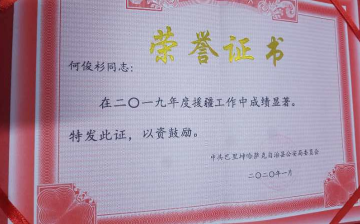 何俊杉,男,1996年出生,共青团员,2018年9月入学,外国语学院2018级应用日语2班学生,2019年1月报名参加为期一年的河南省援疆计划,被派驻哈密市巴里坤县公安局担任辅警工作,任职于巴里坤松树塘公安检查站,现复学到2019级应用日语2班。