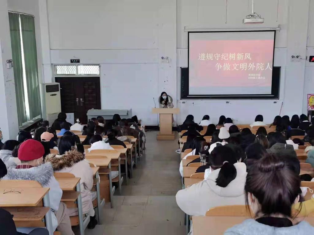 根据学校关于疫情防控和开学各项工作要求,外国语学院2月20日组织全体学生召开了“遵规守纪树新风 争做文明外院人”主题班会。